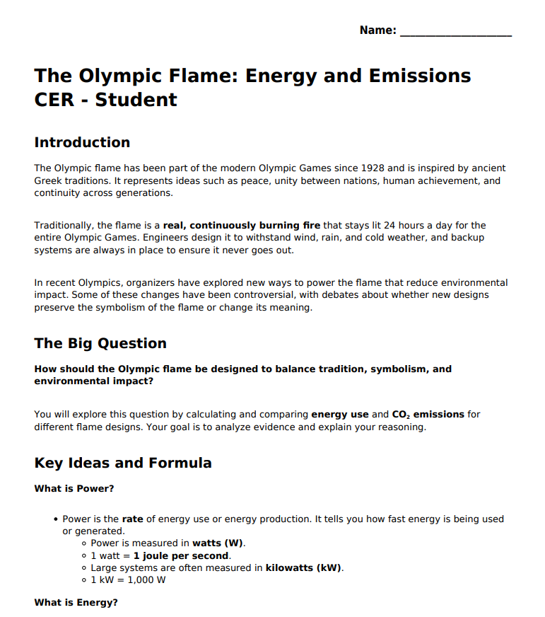 That shared context makes February a great time to connect classroom learning to something students are already seeing outside of school. Our newest Winter Olympics–themed lesson, The Olympic Flame: Energy and Emissions CER, uses one familiar symbol, the Olympic flame, as a way into deeper conversations about energy systems, environmental impact, and design trade-offs.