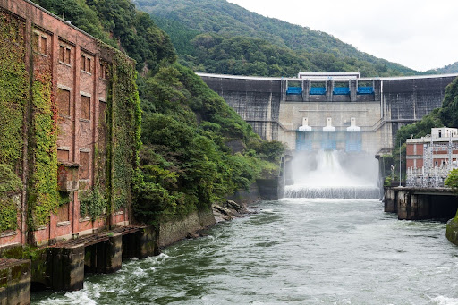 Looking at the picture of a hydroelectric dam, identify and describe the area of the dam system where the water is stored and has the highest potential energy.