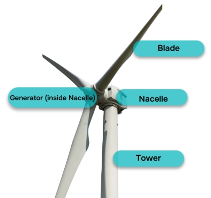 A wind turbine is made up of four major parts: the blades, nacelle, generator, and tower.